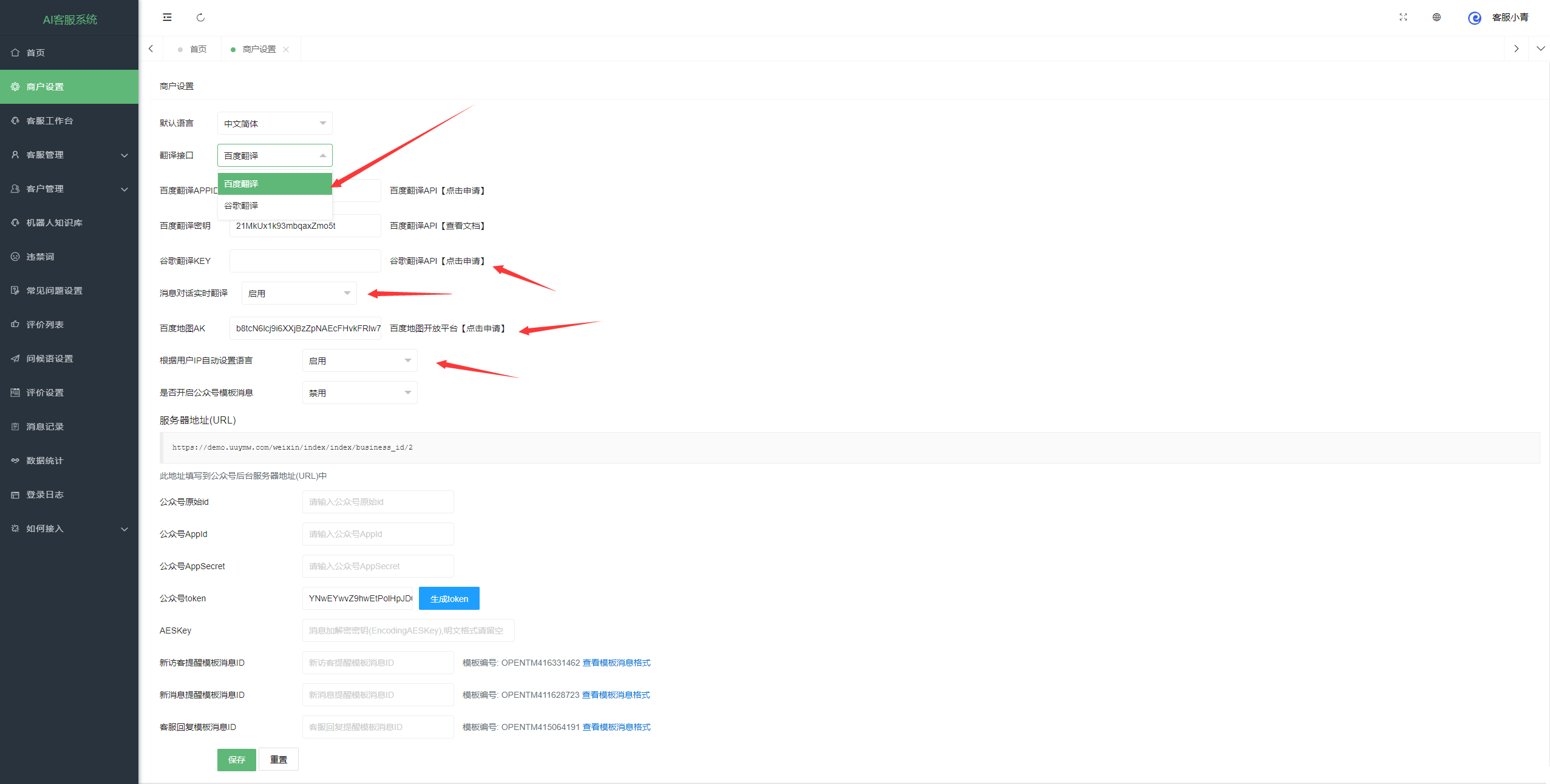 8月4号更新日志:更新谷歌翻译接口,更新发送语音功能,更新地图发送功能,优化前端接待页面UI。