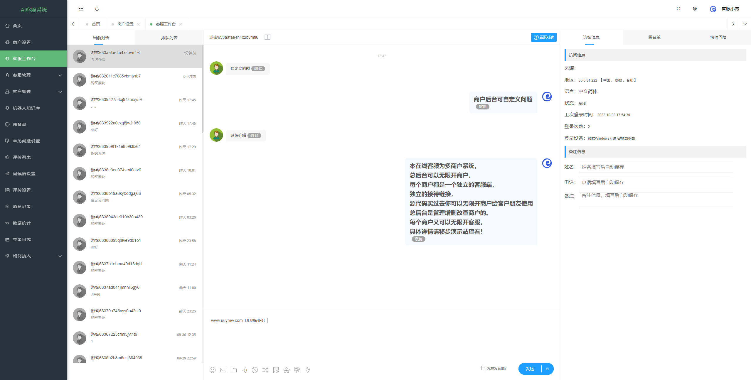 - 支持备注客户信息、可设置黑名单、支持客服后台快捷回复(后台添加设置)
