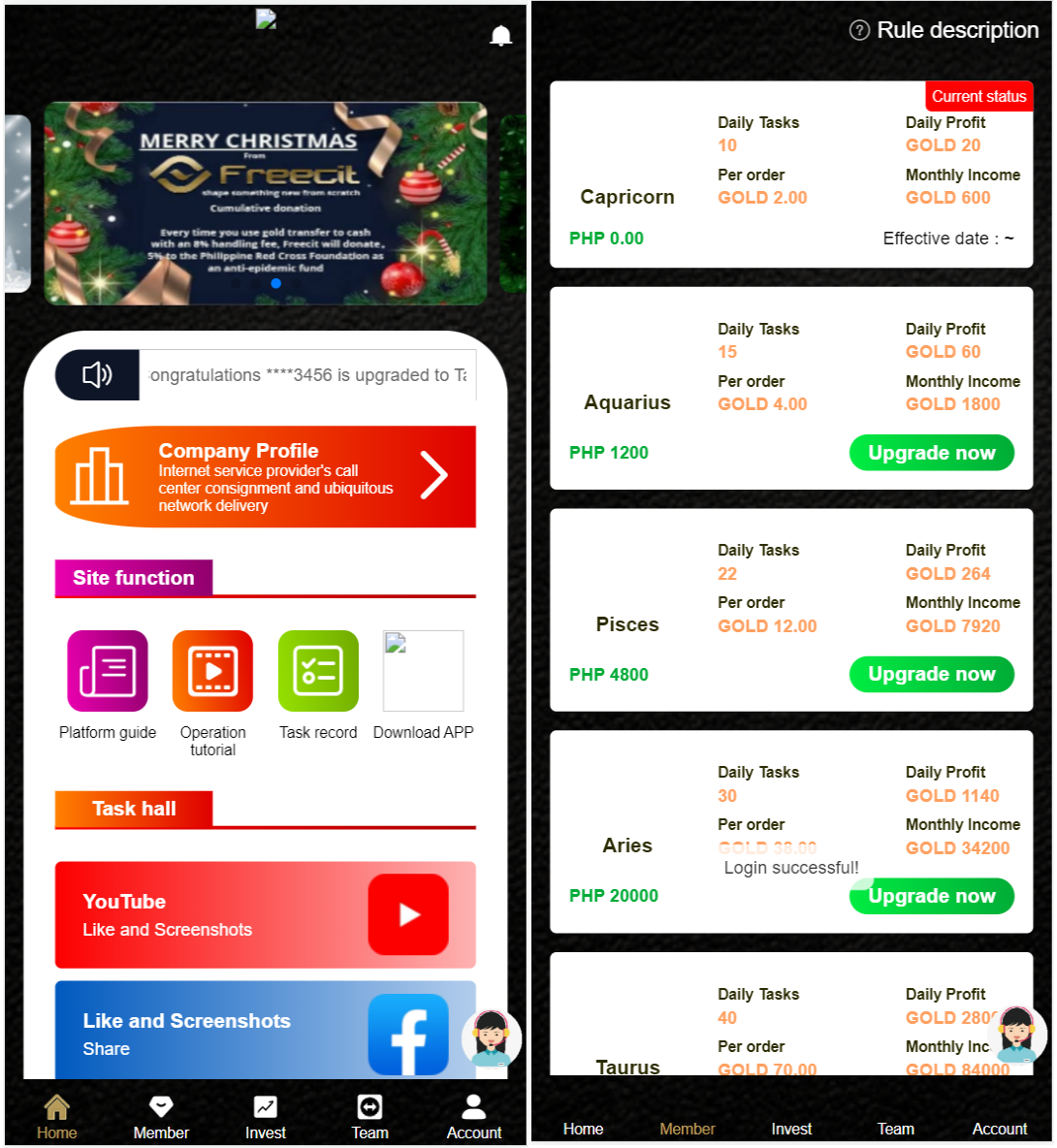 财神集团 外汇/交易所/微盘 最新海外任务点赞系统/TIKTOK脸书任务平台/金币兑换系统 统简单易懂,裂变速度极快,内置客服系统 源码前端二开独家UI,新增金币系统,用户完成获得是金币,然后需要兑换成提现货币