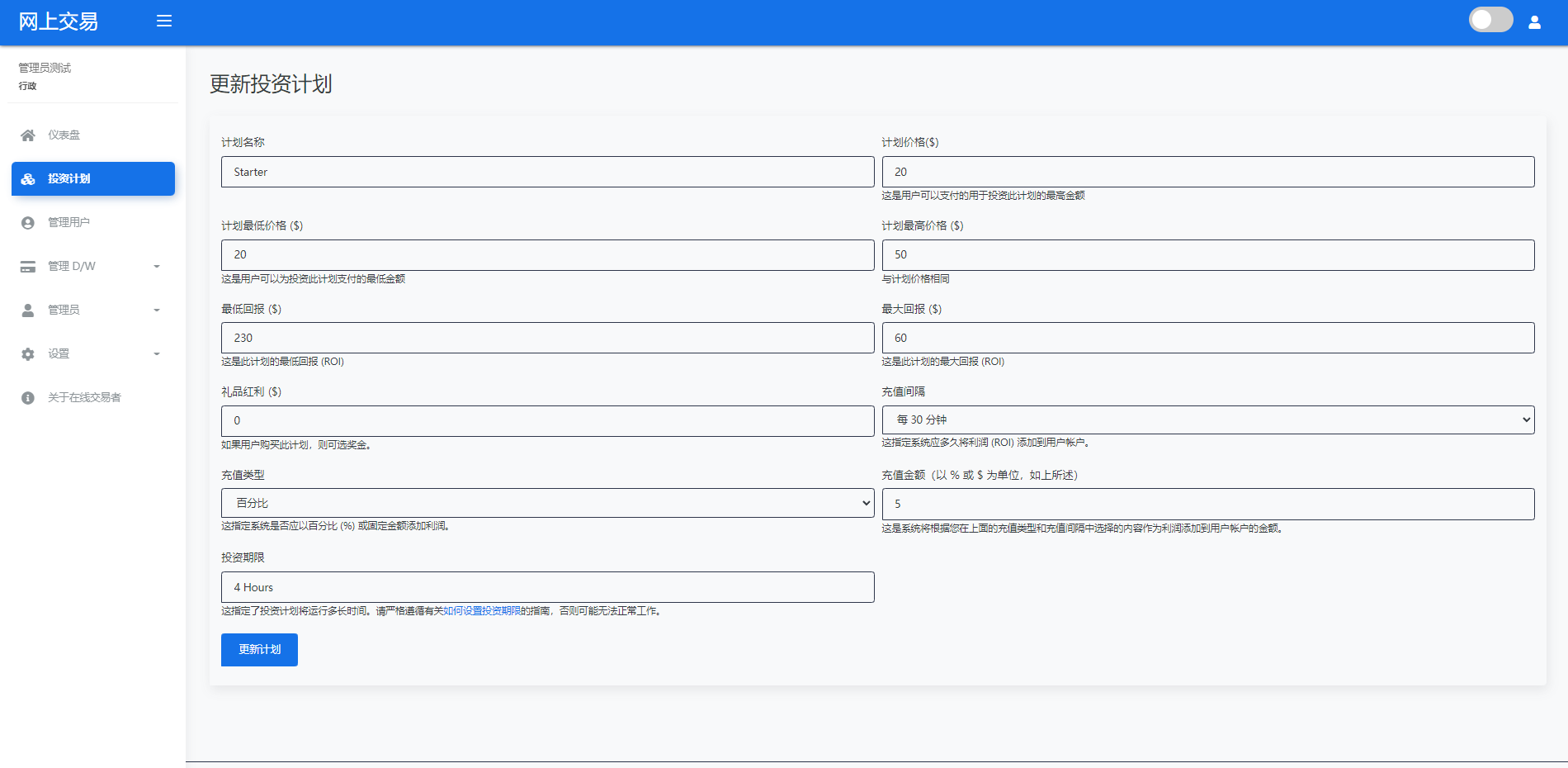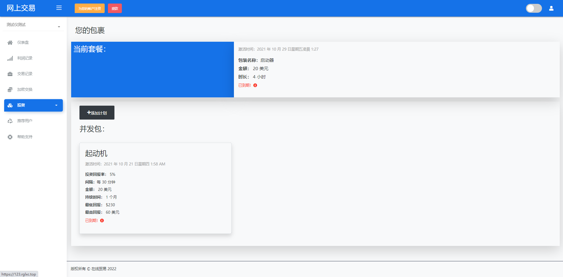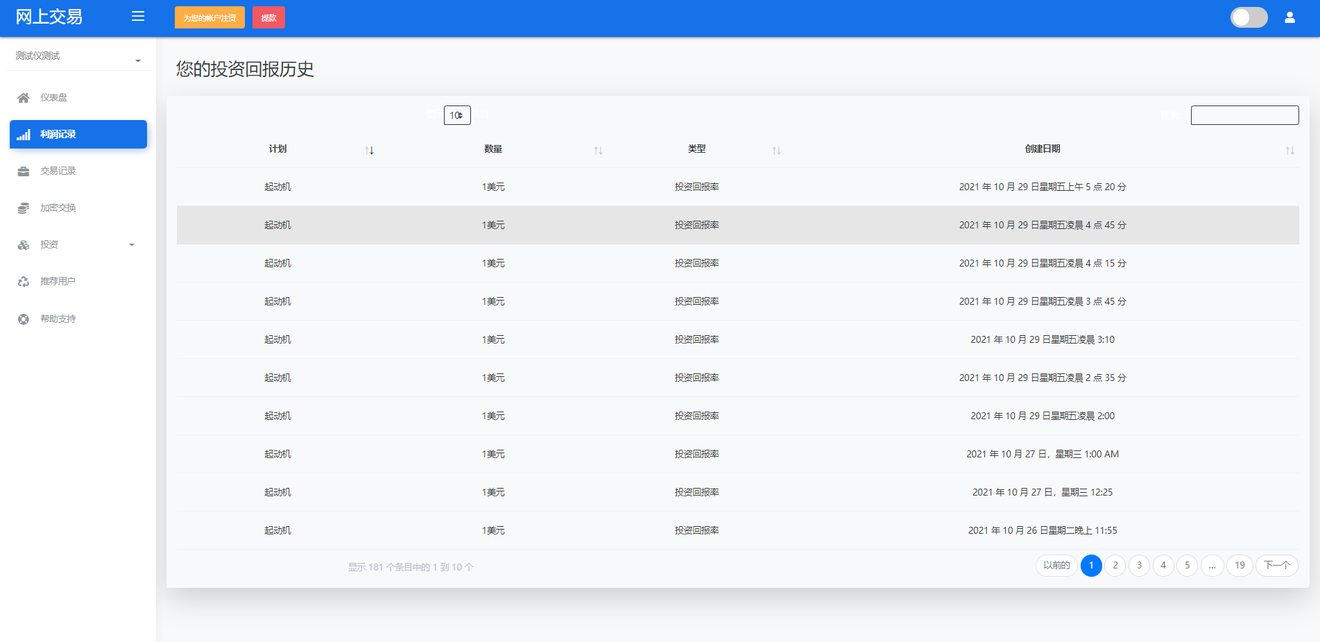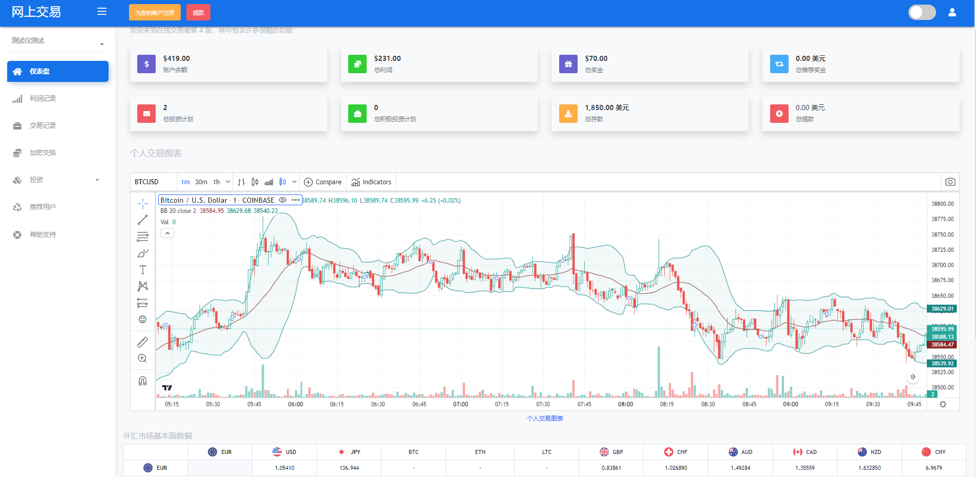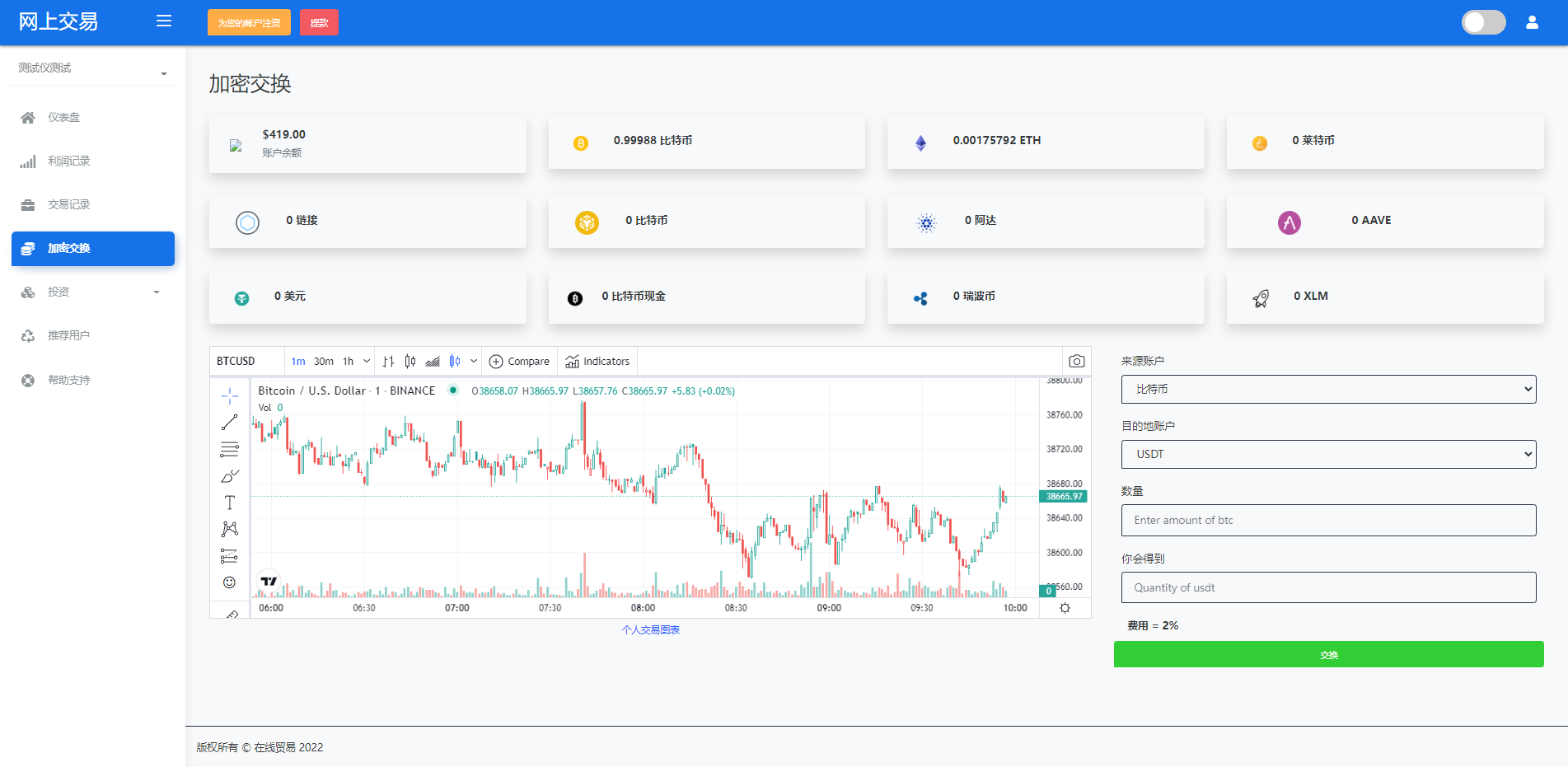财神集团 外汇/交易所/微盘 【海外交易】理财投资/虚拟币场外交易系统/源码自适应 系统支持虚拟币交易实时交易附带行情实时跳动 支持虚拟币理财,自定义添加投资计划 支持虚拟币交易场外互换交换功能 支持USDT虚拟币充值提币、还有Paypal等其他通道 系统为纯英文版,截图是浏览器自动翻译 简单而言本系统就是简化理财投资和加密货币的投资系统和虚拟币行情实时监控的一个交易系统