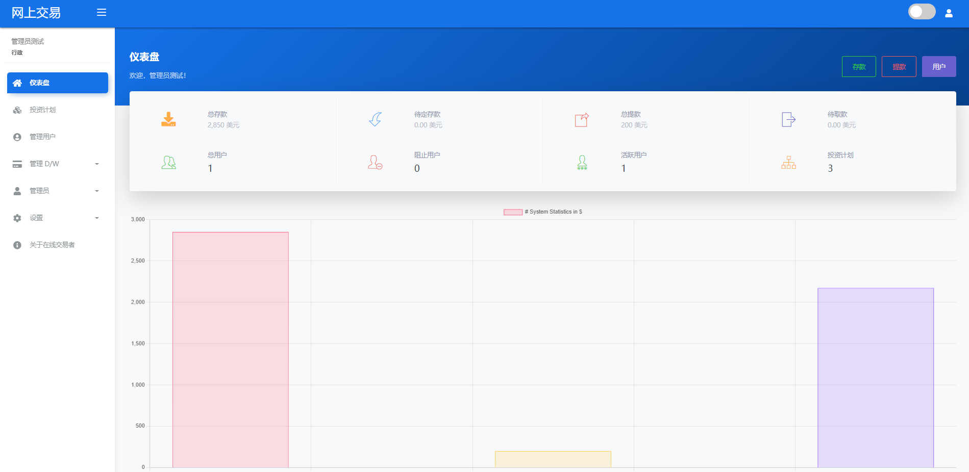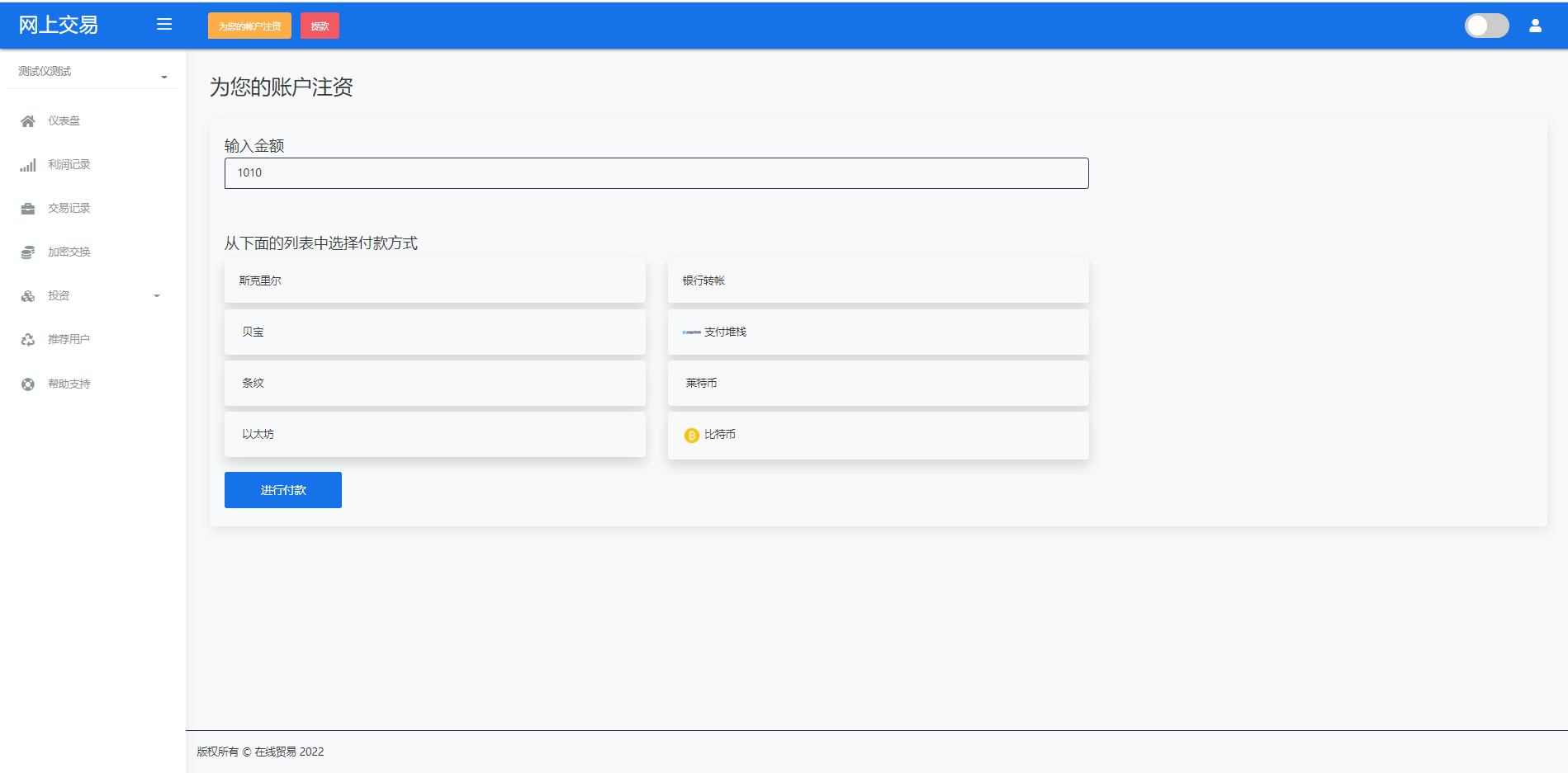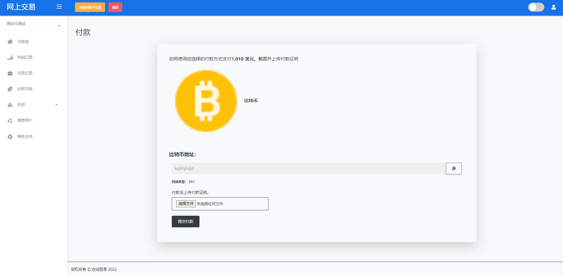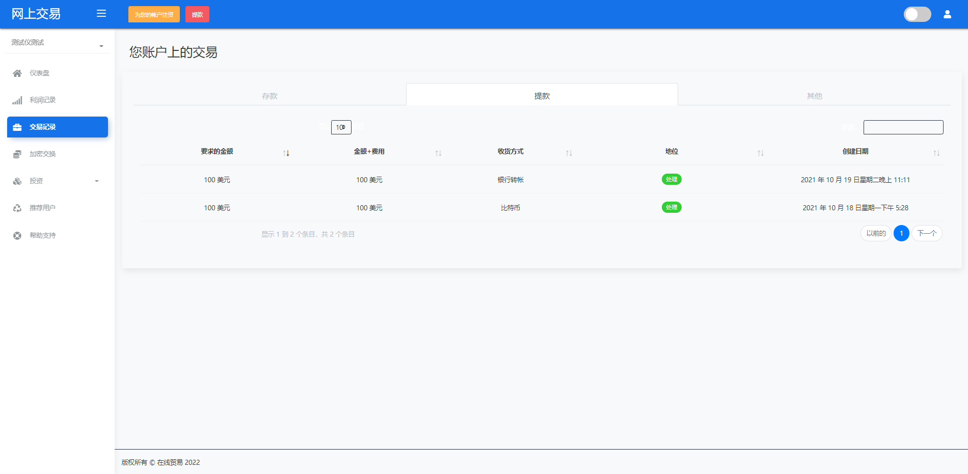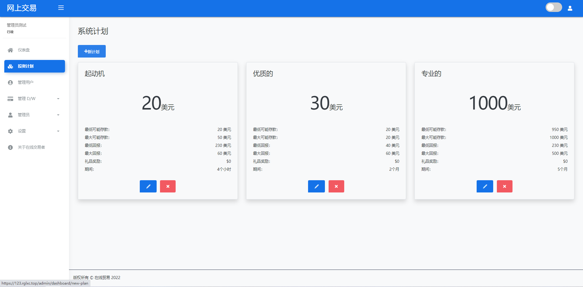 财神集团 外汇/交易所/微盘 【海外交易】理财投资/虚拟币场外交易系统/源码自适应 系统支持虚拟币交易实时交易附带行情实时跳动 支持虚拟币理财,自定义添加投资计划 支持虚拟币交易场外互换交换功能 支持USDT虚拟币充值提币、还有Paypal等其他通道 系统为纯英文版,截图是浏览器自动翻译 简单而言本系统就是简化理财投资和加密货币的投资系统和虚拟币行情实时监控的一个交易系统
